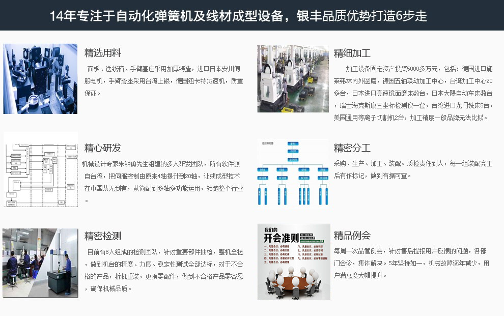 銀豐自動(dòng)化科技(杭州)有限公司2014年成立于浙江杭州。是中國(guó)浙江專業(yè)生產(chǎn)彈簧機(jī)及線材折彎?rùn)C(jī)的技術(shù)型企業(yè)。2014年公司運(yùn)用日本新先進(jìn)的伺服系列控制技術(shù),進(jìn)行一次次具有重要意義的技術(shù)改革,打破傳統(tǒng)的凸輪帶動(dòng)成型模式,成為浙江省內(nèi)能夠獨(dú)立生產(chǎn)無(wú)凸輪模式兼?zhèn)錂C(jī)械手的彈簧機(jī)及轉(zhuǎn)線線材折彎?rùn)C(jī),目前公司每年銷售各類機(jī)型7百余臺(tái),成為行業(yè)銷量領(lǐng)先的企業(yè),也因?yàn)楦咝詢r(jià)比被廣大客戶群體追捧,同時(shí)也受到部分友商的詆毀。